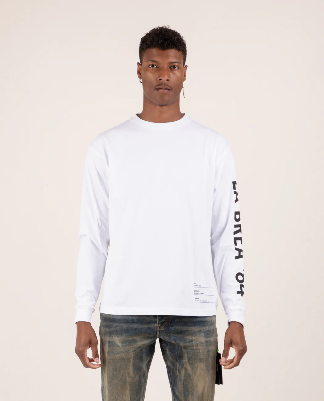 La Brea Ave L/S tee in white by Neon Denim Brand exclusively for American Rag. This regular-fit tee features a crew neck and long sleeves, with 'La Brea Ave '84 printed at the sleeve and across the back. It's perfect for showing your love for La Brea Avenue.