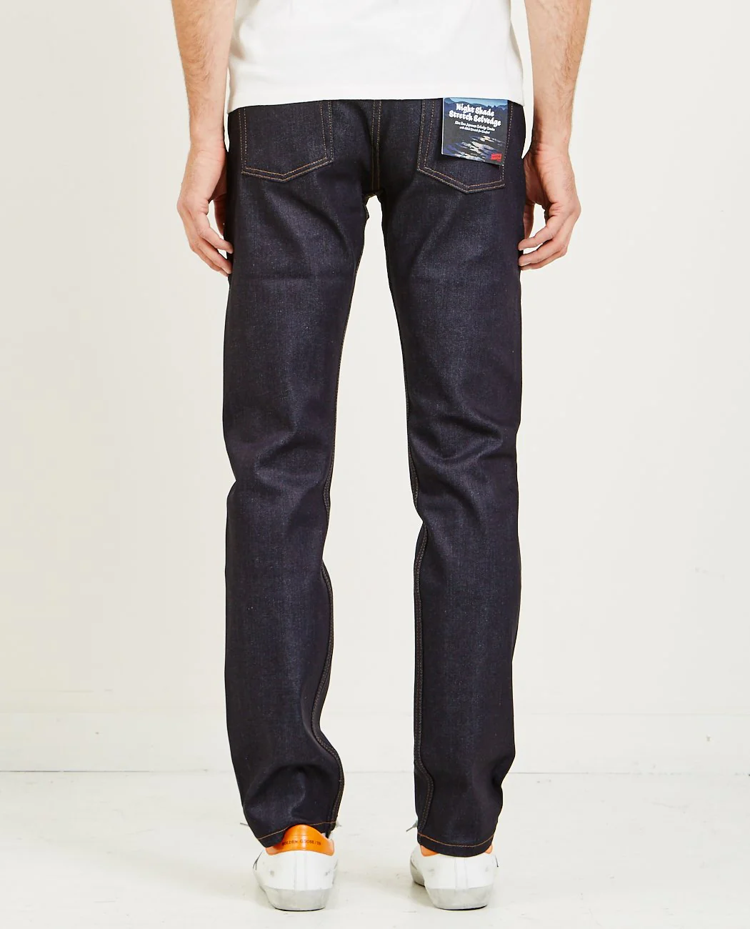 THE WEIRD GUY IN NIGHTSHADE STRETCH SELVEDGE INDIGO BY NAKED & FAMOUS. 12 OZ JAPANESE SELVEDGE DENIM WITH 2% STRETCH FOR ADDED COMFORT. THE COLOR OF THE DENIM IS CREATED WITH THE ADDITION OF A BLACK DYE TO THE INDIGO, THE COMBINATION CREATES A RICH INDIGO TONE THAT IS NEARLY BLACK.
